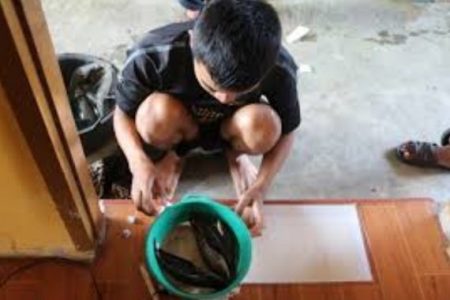 - Masukan ikan pada ember yang sudah diisi air.